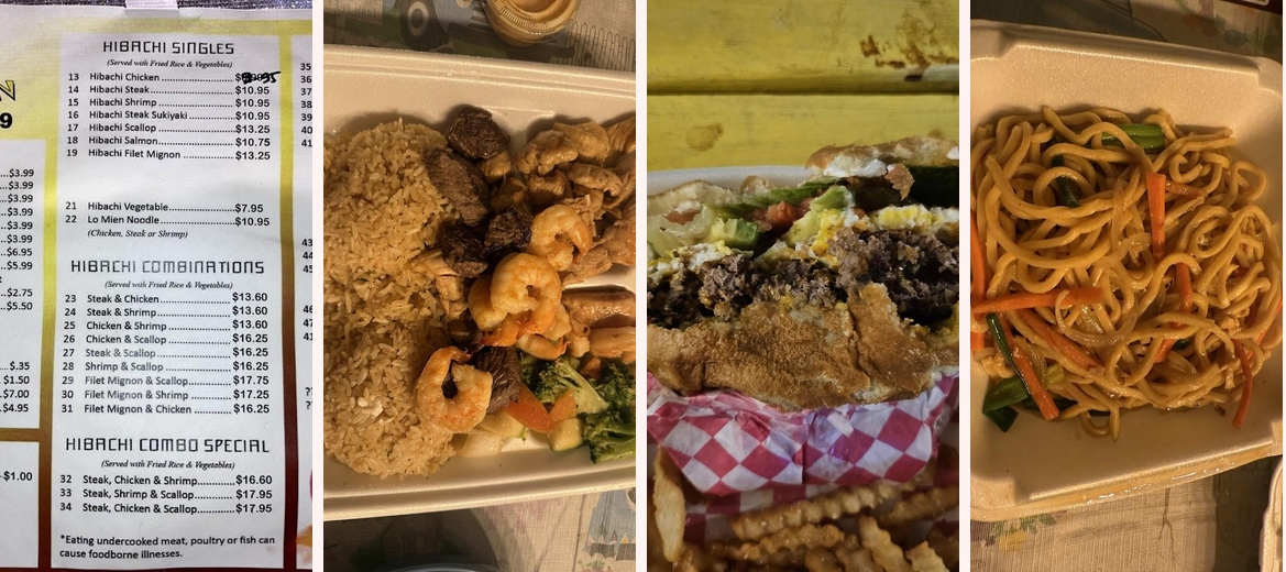 The menu features a variety of comfort foods, including steak, shrimp, lo mein, and several hibachi combinations, perfect for a quick bite or a sit-down meal.
